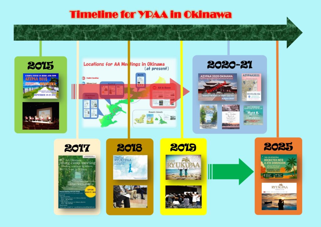 AZYPAAは、2012年に東京でアジア地域のICYPAAとして開始されました。それから、メンバーは以降の3年間、同じ場所でイベントを開催しました。2015年に、沖縄は最初の国際AA会議であるAZYPAA2015を開催しました。軍のグループは1947年と日本人のグループは1987年と、それぞれ始まってから、アメリカ人AAメンバーと地元の沖縄メンバーが一堂に会した最初の機会でした。